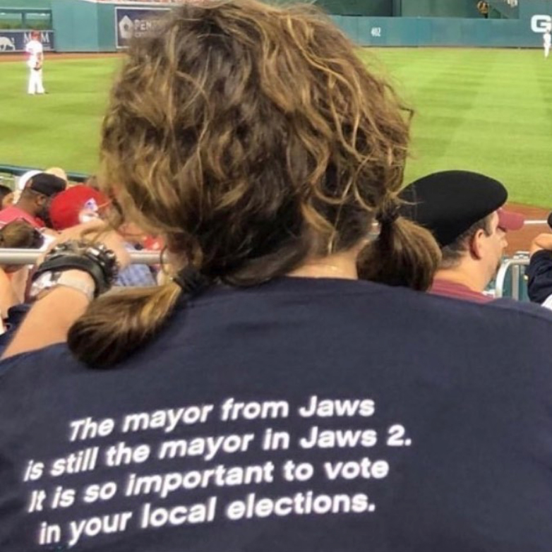 This t-shirt is sure to get a few laughs. The word VOTE is displayed on the front chest area with a great white tooth. The back of the shirt reads, “The mayor from Jaws is still the mayor in Jaws 2. It is so important to vote in your local elections.” Find it at Amazon…